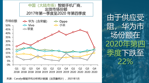 2020年第四季度,華為(包括榮耀)市場份額從2020年第三季度的41%下降至22%。
