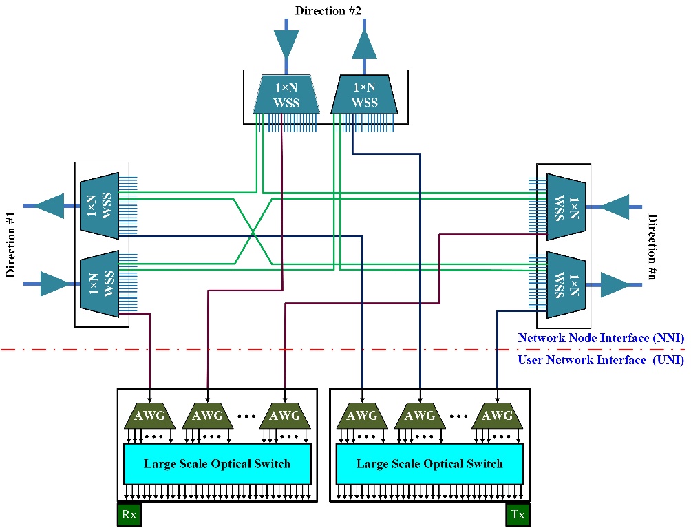 每個ROADM節(jié)點包含一個網(wǎng)絡節(jié)點接口(NNI)和一個用戶網(wǎng)絡接口(UNI)。NNI互連來自/去往多個傳輸方向的DWDM信號,這些DWDM信號以波長粒度在各傳輸方向之間切換。UNI以波長粒度下載目的地為本節(jié)點的信號,并從本節(jié)點上傳信號。為了實現(xiàn)無阻塞的波長交換和上/下載,新一代ROADM節(jié)點要求具有無色、無方向性和無競爭(CDC ROADM)的特點。