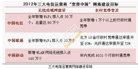 基于工信部對(duì)于“寬帶中國(guó)”2012年工作目標(biāo),日前三大電信運(yùn)營(yíng)商同期公布了各自的2012計(jì)劃。