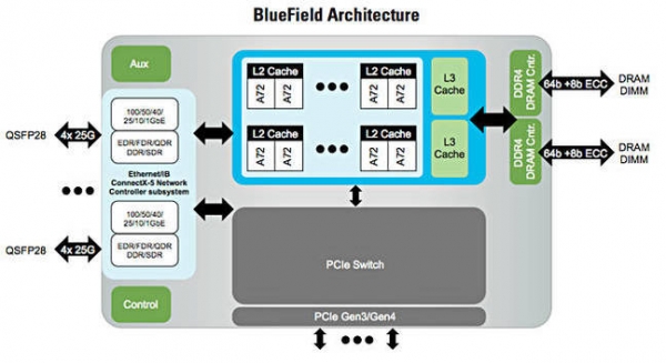 Mellanox公司指出:"BlueField系統(tǒng)芯片家族通過連續(xù)網(wǎng)狀網(wǎng)絡、DDR4內(nèi)存控制器、多個支持10/25/40/50/100 Gbit每秒的以太網(wǎng)/InfiniBand端口以及一套具備多端口且支持EP SR-IOV與RC功能的PCIe Gen 3.0/4.0集成化PCIe交換機共同實現(xiàn)了一組64位ARMv8 A72計算核心的彼此互連。該系統(tǒng)芯片主要面向那些將數(shù)據(jù)層與控制層服務相結合以實現(xiàn)存儲與網(wǎng)絡功能的I/O敏感型與計算敏感型應用。"
