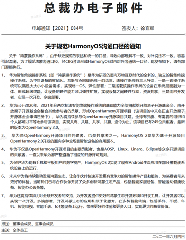 另外,華為在心聲社區(qū)發(fā)布《關于規(guī)范HarmonyOS溝通口徑的通知》提到,華為是OpenHarmony開源項目的共建者、也是共享者之一。