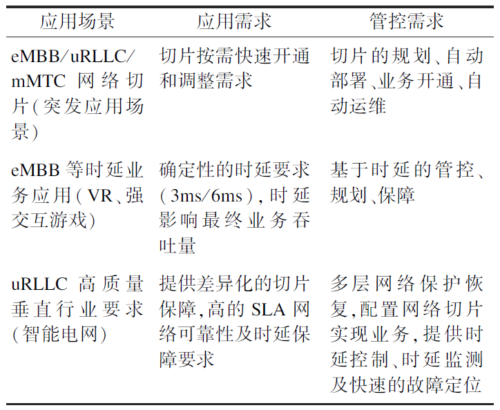 不同的5G業(yè)務(wù)應(yīng)用場景帶來了新的端到端業(yè)務(wù)協(xié)同管控需求。如表1所示,增強(qiáng)移動寬帶(eMBB)、超高可靠超低時延通信(uRLLC)、海量機(jī)器類通信(mMTC)網(wǎng)絡(luò)應(yīng)用場景需要管控系統(tǒng)支持切片的快速創(chuàng)建與調(diào)整,要求管控系統(tǒng)具備切片的規(guī)劃、自動部署、業(yè)務(wù)開通及自動運(yùn)維能力。低時延業(yè)務(wù)應(yīng)用,比如虛擬現(xiàn)實(VR)、強(qiáng)交互性的游戲則要求網(wǎng)絡(luò)具備3 ms/6 ms量級的低時延保障,因此要求管控系統(tǒng)具備基于時延的業(yè)務(wù)管控、路徑規(guī)劃及業(yè)務(wù)性能保障能力;uRLLC高質(zhì)量垂直行業(yè)(如智能電網(wǎng))等應(yīng)用場景,則要求5G承載網(wǎng)絡(luò)提供差異化的切片保障、高業(yè)務(wù)等級協(xié)議(SLA)網(wǎng)絡(luò)可靠性及時延保障。