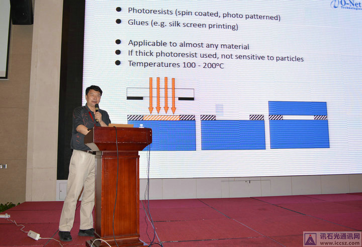 在有關(guān)光通信芯片發(fā)展的演講之后是《光器件封裝發(fā)展趨勢》主題演講,演講者是昂納光通信全球市場推廣副總裁華一敏博士。華博士負(fù)責(zé)監(jiān)管本集團(tuán)光網(wǎng)絡(luò)部之無源光器件、模塊、子系統(tǒng)及放大器,以及自動化及傳感部之激光雷達(dá)(LiDAR)的產(chǎn)品營銷和產(chǎn)品管理,擁有二十幾年行業(yè)經(jīng)驗。華博士提到“為什么要探索晶片鍵合過程?”我們的目標(biāo)是將芯片級封裝推向圓片級,第一是減少功能設(shè)備的空間和成本;第二是提高功能器件的可靠性和成本;第三是構(gòu)建新型功能器件。隨后,華博士在演講主要為我們講到晶片鍵合技術(shù)、晶圓鍵合技術(shù)的比較和芯片級封裝是目標(biāo)這幾大部分。