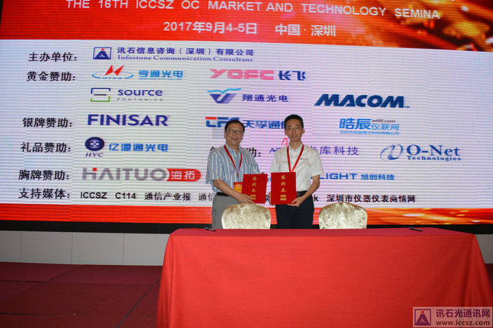 在十位嘉賓的精彩演講中,4號會議漸漸接近接近尾聲,最后環(huán)節(jié)是訊石與陜西光電子集成電路先導(dǎo)技術(shù)研究所(以下簡稱:先導(dǎo)所)的合作簽約儀式。先導(dǎo)所是由中科院西安光機(jī)所聯(lián)合重點高校、科研院所共同發(fā)起的國內(nèi)首家“產(chǎn)-學(xué)-研-資-用-孵”相結(jié)合的光電子集成產(chǎn)業(yè)孵化公共平臺,為項目提供全生命周期的專業(yè)技術(shù)、知識、裝備、專項基金、專業(yè)團(tuán)隊管理和服務(wù)。而訊石是中國第一家以光通信企業(yè)為對象的專業(yè)化咨詢服務(wù)機(jī)構(gòu)。公司自2001年成立以來,為海內(nèi)外眾多光通信行業(yè)提供行業(yè)預(yù)測、企業(yè)規(guī)劃、市場信息等前瞻性服務(wù)公司現(xiàn)已成為國際化的光通信顧問咨詢權(quán)威機(jī)構(gòu)。