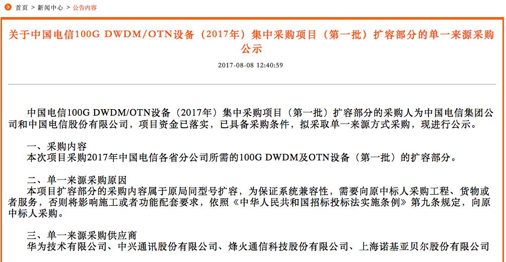 中國電信擬采用單一來源供應(yīng)商,從華為技術(shù)有限公司、中興通訊股份有限公司、烽火通信科技股份有限公司、上海諾基亞貝爾股份有限公司四家公司采購。