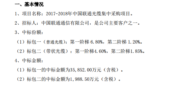 公告顯示,通鼎互聯(lián)標(biāo)包一(普通光纜)的中標(biāo)份額為第一階梯6.80%,第二階梯1.20%,中標(biāo)金額為35852萬元。標(biāo)包二(帶狀光纜)中標(biāo)份額為第一階梯4.60%,第二階梯1.85%,中標(biāo)金額將近為1988.5萬元。項(xiàng)目總中標(biāo)金額達(dá)3.78億元(含稅)。