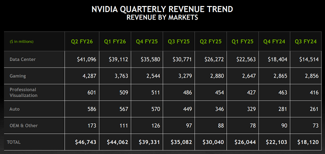 ICC訊 英偉達(NASDAQ: NVDA)于2025年8月27日公布了截至2025年7月27日的2026財年第二季度財務(wù)業(yè)績。該季度收入達到467億美元,環(huán)比增長6%,同比增長56%。其中,Blackwell數(shù)據(jù)中心收入環(huán)比增長17%。