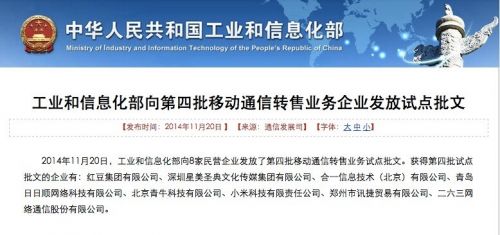 ICCSZ訊 11月20日消息,工信部向8家民營(yíng)企業(yè)發(fā)放第四批虛擬運(yùn)營(yíng)商牌照,小米、優(yōu)酷土豆、海爾日日順等企業(yè)獲得牌照。而此前曝光的聯(lián)想、民生銀行、平安集團(tuán)、富士康等未在名單之列。