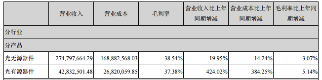 分產(chǎn)品看,博創(chuàng)光無源器件營收近2.75億元,同比增長19.95%,占總營收86.51%。業(yè)績(jī)亮點(diǎn)是光有源器件,該部分盡管營收4283萬元,只占總營收13.49%,但增幅達(dá)到驚人的424.02%。