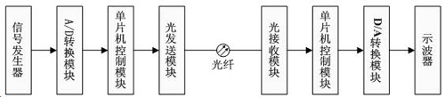 本設計利用光發(fā)送模塊、光接收模塊以及光纖,設計并制作一套簡易光纖傳輸系統(tǒng)??傮w方案如下圖所示。利用信號發(fā)生器產(chǎn)生待傳送的模擬信號,經(jīng)A/D轉(zhuǎn)換電路變?yōu)閿?shù)字電平,再通過光發(fā)送模塊與光接收模塊傳輸數(shù)據(jù),并通過D/A轉(zhuǎn)換及數(shù)據(jù)處理電路對其進行處理。處理后的結(jié)果可通過示波器與信號發(fā)生器的輸出波形對比觀察。為了實現(xiàn)A/D轉(zhuǎn)換功能,D/A轉(zhuǎn)換功能與對信號處理的能力,特引入單片機控制模塊。