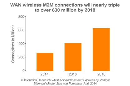 * Infonetics公司預測2013至2018年全球M2M服務收入復合年增長率為18%。