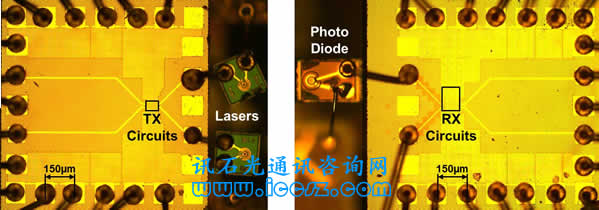 光纖連接測試芯片,包括發(fā)射器(TX)電路,激光二極管,光電二極管和收發(fā)器(RX)電路。圖片來自IBM。