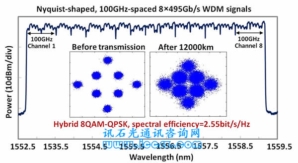 在該系統(tǒng)中,可調(diào)頻譜效率的Nyquist形400Gb/s信號是使用調(diào)制子載波產(chǎn)生的。8路100GHz間隔400Gb/s WDM信號結(jié)合在一起,并在由100-km光纖長度構(gòu)成的重新循環(huán)傳輸測試平臺上進(jìn)行傳輸。