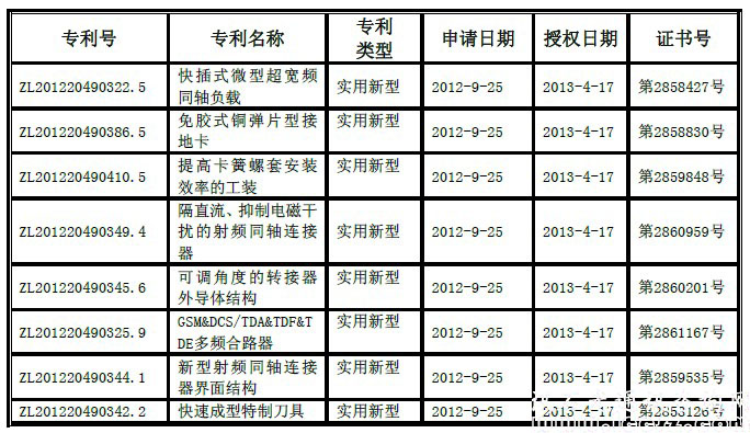第七項(xiàng)“新型射頻同軸連接器界面結(jié)構(gòu)”公開了一種新型射頻同軸連接器界面結(jié)構(gòu),包括外導(dǎo)體、護(hù)套、內(nèi)導(dǎo)體,其特征在于,所述外導(dǎo)體的一端為帶M29X1 螺紋的接口,所述護(hù)套是一種性能穩(wěn)定的高彈性合金塑料,所述內(nèi)導(dǎo)體的一端為開了槽的彈片,所述護(hù)套為采用性能穩(wěn)定的高彈性合金塑料,位于外導(dǎo)體和內(nèi)導(dǎo)體之間且用于包裹內(nèi)導(dǎo)體,本實(shí)用新型能與IEC 60169-4, VG 95250, EN 122190,CECC22190,DIN 47233 五種標(biāo)準(zhǔn)互配的連接器界面,可用于無(wú)線電設(shè)備、室內(nèi)分布系統(tǒng),射頻發(fā)射機(jī)和接收機(jī)等互連用的連接器。