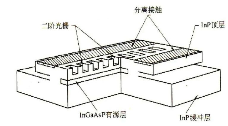 DFB(Distributed Feedback Laser)分布式反饋激光器是在FP激光器的基礎(chǔ)上,將布拉格光柵集成到激光器內(nèi)部的有源層中(也就是增益介質(zhì)中),在諧振腔內(nèi)形成選模結(jié)構(gòu),實(shí)現(xiàn)單模工作,屬于邊發(fā)射類型,用的是水平腔結(jié)構(gòu)。