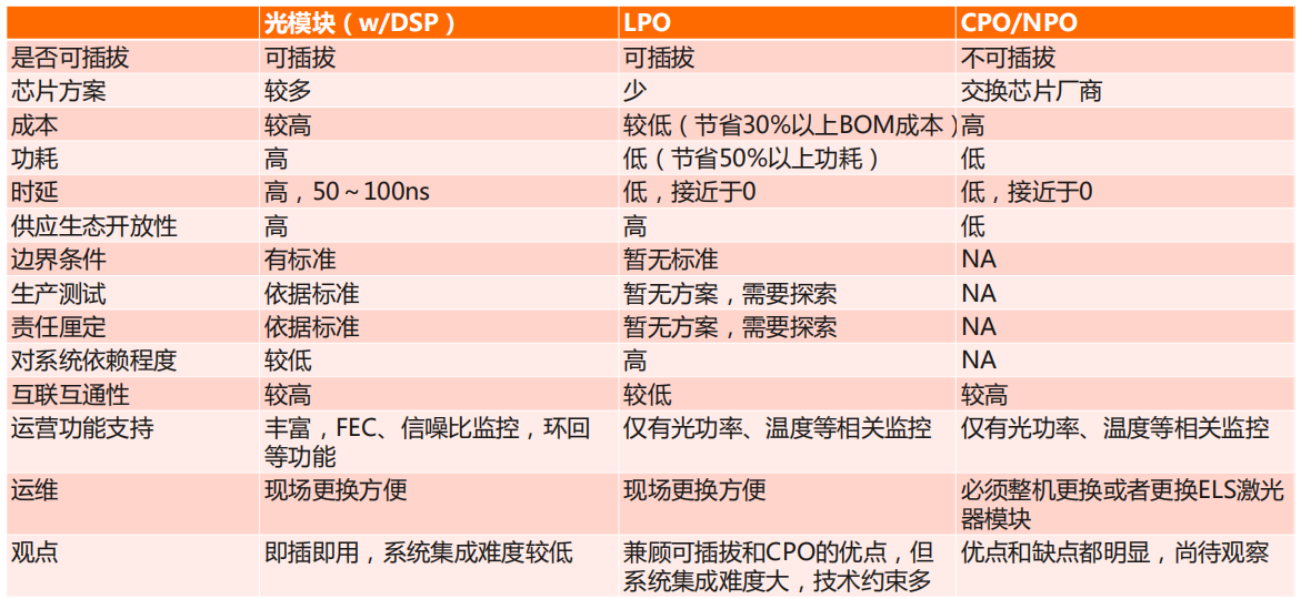 隨著交換機Serdes速率和數(shù)量的增加,現(xiàn)今,光模塊功耗占設(shè)備總功耗高達(dá)1/3。低功耗、低時延的光互聯(lián)技術(shù)更適合超算,陸睿對比了LPO/CPO/NPO技術(shù)的對比和選擇,他認(rèn)為LPO優(yōu)點是兼顧可插拔和CPO的優(yōu)點,但系統(tǒng)集成難度大,技術(shù)約束多。CPO/NPO優(yōu)缺點都很明顯,尚待觀察。
