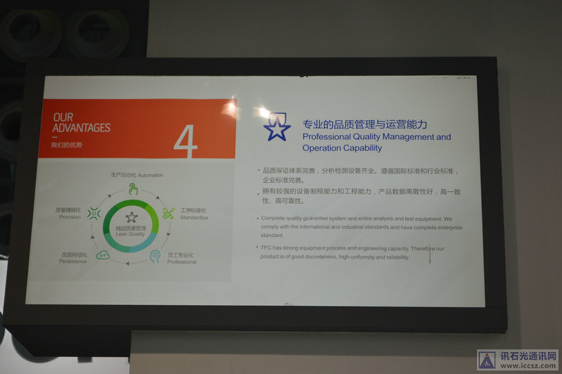 Iccsz訊(編輯:Aiur)9月9日,CIOE2017進入最后一天,或許來參觀看展的人少了許多,但正如訊石石總所言,留在最后的往往是真實的客戶,一切成功貴在堅持!隨著中國寬帶戰(zhàn)略進入新階段,超高速率是通信行業(yè)發(fā)展的目標(biāo),在轉(zhuǎn)型升級發(fā)展上,運營商、設(shè)備商和器件商都鉚足了勁。光通信越發(fā)火熱,CCTV對CIOE的播報可以看出國家對光通信的重視。光器件是通信中極為關(guān)鍵的部分,成本占據(jù)光網(wǎng)絡(luò)中的六成,而隨著光通信市場的發(fā)展,光器件企業(yè)也迎來新的契機,越來越多企業(yè)選擇上市,登陸資本市場。