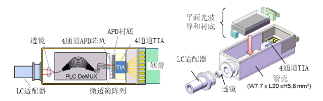 下一代100G 客戶側(cè)光收發(fā)模塊—CFP2的體積將減小到目前的三分之一,功耗將減小為當(dāng)前的一半,傳統(tǒng)的分立光電器件已難以滿足這種需求,基于集成技術(shù)的4×25Gb/s光發(fā)射組件TOSA和光接收組件ROSA應(yīng)運(yùn)而生。NTT的研究小組利用單片集成和混合集成技術(shù)分別實(shí)現(xiàn)了小型化的TOSA[3]和ROSA[4]器件,如圖4和圖5所示。