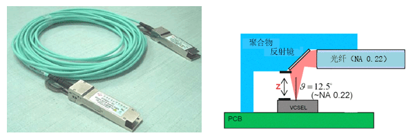 短距離的40G-SR4 QSFP+通常采用850nm 面發(fā)射激光器VCSEL陣列芯片和探測器陣列芯片作為發(fā)射和接收芯片,通過多模帶狀光纖實(shí)現(xiàn)光模塊間的對傳,如圖8所示。由于VCSEL激光器的寬光譜和多模光纖較大的彎曲損耗,該光模塊的傳輸距離通常只有100m-150m。由于VCSEL和PD芯片均為面型,為實(shí)現(xiàn)同多模光纖的耦合,可以有光路彎折和電路彎折兩種解決方案。為避免電路彎折引入的較大電學(xué)損耗,實(shí)現(xiàn)單通道10G傳輸,光路彎折的方案更為理想。器件結(jié)構(gòu)上,VCSEL陣列芯片通過高精度貼裝的方式,實(shí)現(xiàn)同聚合物反射鏡的混合集成。采用優(yōu)化反射鏡和耦合透鏡的位置和通光孔徑,可以實(shí)現(xiàn)VCSEL芯片和多模光纖間較高的耦合效率。