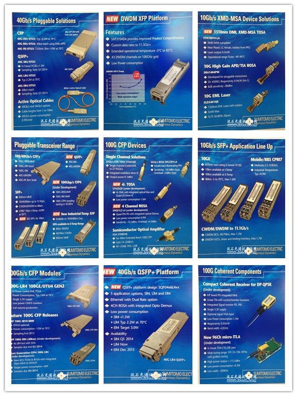 住友電工本次ECOC展出的新品有DWDM XFP 平臺,傳輸速率可達11.3Gb/s,擁有43通道的100G 密集波分復(fù)用器,更低功率損耗。還有10G相關(guān)配套產(chǎn)品,1310nm DML XMD-MSA TOSA等。100G/40G相關(guān)的QSFP+相關(guān)模塊和產(chǎn)品為展出重點,有40G-SR4和40G-LR4/ER4,以及正在開發(fā)的100G的CFP4產(chǎn)品和配套的TOSA和ROSA產(chǎn)品。同時還有推出100G相干收發(fā)器產(chǎn)品如相干接收器,1310nm SOA高功率可調(diào)激光器等。CFP/QSFP+ 產(chǎn)品為住友電工本次出展的重點也是本次展會的熱點,推出產(chǎn)品涉及有100G 40G CFP TOSA/ROSA及模塊, 40G QSFP+ROSA及模塊,25Gb/s ROSA/TOSA。