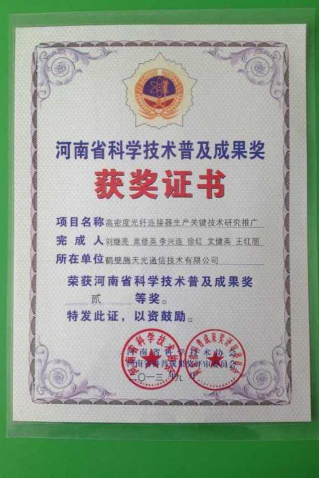 本次獲獎項目是由鶴壁騰天光通信技術有限公司總經(jīng)理劉繼亮率領的團隊(高修英、李興連、徐紅、文建英、王紅麗)完成的“高密度光纖連接器生產(chǎn)關鍵技術研究推廣”,項目獲得河南省科學技術協(xié)會、河南省科普成果獎評審委員會頒發(fā)的河南省科普成果獎二等獎。