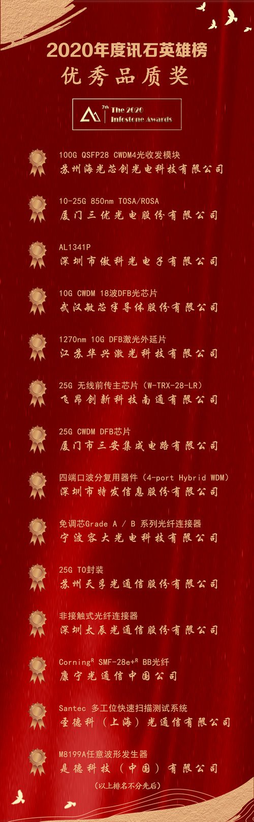 訊石英雄榜評委從眾多參選產品中遴選14家企業(yè)產品,評定它們獲得2020年度優(yōu)秀品質獎,表彰和認可它們在產品質量、可靠性、穩(wěn)定交付和研發(fā)投入等方面的優(yōu)秀表現(xiàn),是光通信產業(yè)和市場的重要參與者。