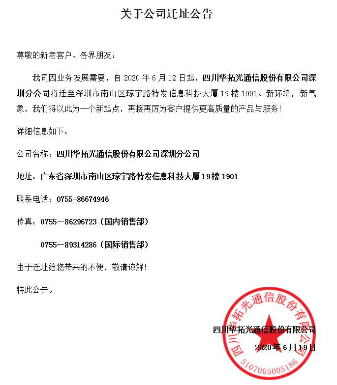 ICC訊 近日,訊石會(huì)員企業(yè)--四川華拓光通信股份有限公司深圳分公司傳來喬遷通知,華拓光通信因業(yè)務(wù)發(fā)展需要,自2020年6月12日起,深圳分公司將遷至深圳市南山區(qū)瓊宇路特發(fā)信息科技大廈19樓1901。