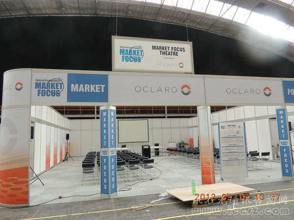 展區(qū)又一大重點(diǎn)區(qū)域Market Focus Theatre ,桌椅已擺放整齊,明日將有不少市場產(chǎn)品簡報(bào)發(fā)布,贊助商OCLARO 新LOGO清晰可見。