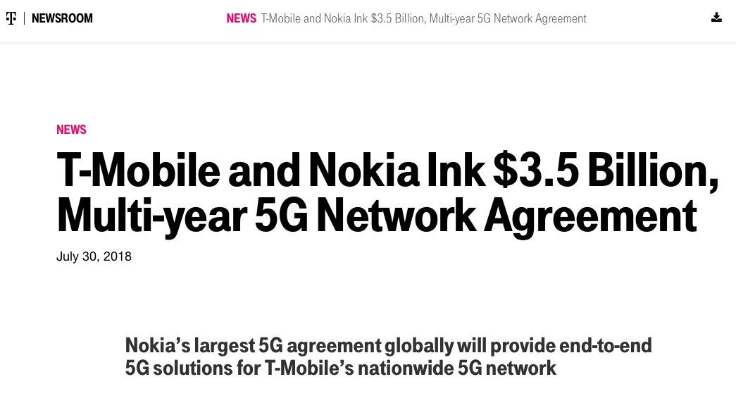 2018年7月30日,T-Mobile和諾基亞官方同時(shí)發(fā)布:T-Mobile和諾基亞簽署了一筆價(jià)值35億美元的協(xié)議,諾基亞將在未來(lái)幾年內(nèi)向T-Mobile提供完整的端到端5G技術(shù)、軟件和服務(wù)組合,以幫助T-Mobile加速全國(guó)5G部署。