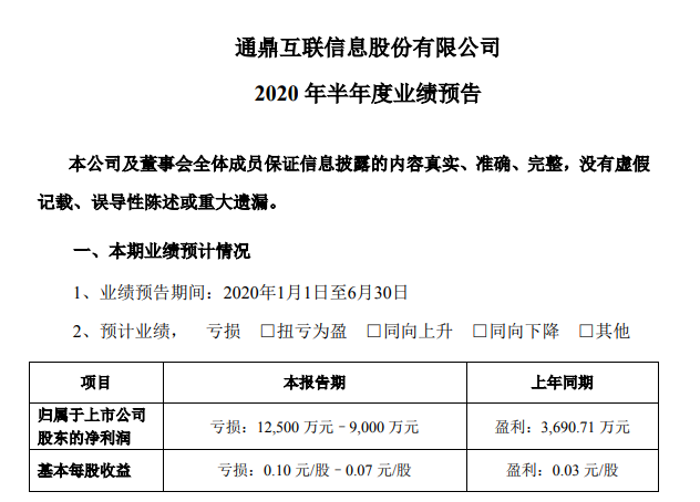 ICC訊 (編輯:Nicole)通鼎互聯(lián)信息股份有限公司(以下簡稱:通鼎互聯(lián))發(fā)布2020年半年度業(yè)績預告:預計2020年上半年度業(yè)績虧損,歸屬于上市公司股東的凈利潤虧損12,500 萬元–9,000 萬元,去年同期實現(xiàn)盈利3,690.71 萬元。