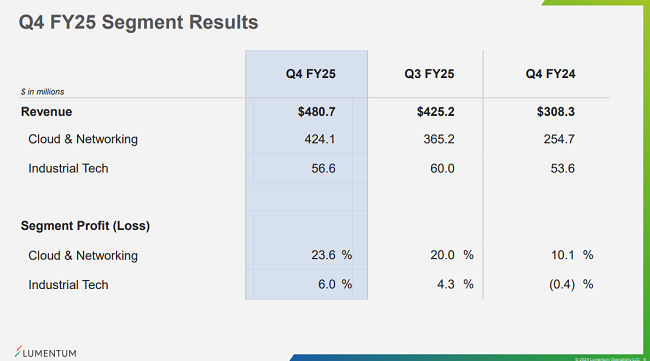 Lumentum表示,云計算和人工智能投資正在加速,改變各行業(yè)并推動長期光學(xué)需求。在強有力的執(zhí)行和強勁的云計算需求推動下,第四季度的收入和每股收益(EPS)超出了此前上調(diào)的業(yè)績指引。