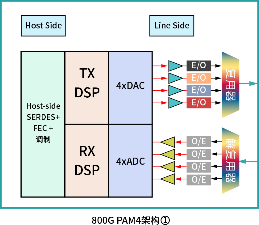 基于PAM4調(diào)制的800G光模塊有兩種設(shè)想架構(gòu):
