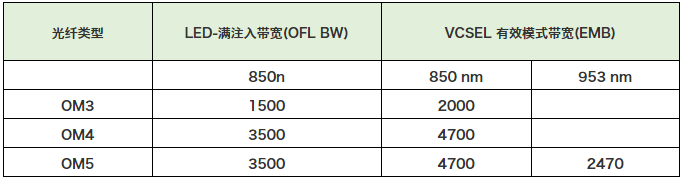 由于多模光纖本身的特點(diǎn),有多達(dá)19個(gè)模式組可以在多模光纖中傳輸,如果不加以精確控制,其模式之間的色散可能非常大。如果采用VCSEL,模式色散一般通過(guò)有效模式帶寬EMB進(jìn)行反映,如果采用LED,則用滿注入帶寬OFL BW來(lái)表示。