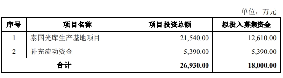 泰國光庫生產(chǎn)基地項(xiàng)目預(yù)計總投資2.1億元,其中本次向特定對象發(fā)行股票募集資金擬投入1.26億元,不足部分將由公司通過自籌方式解決。