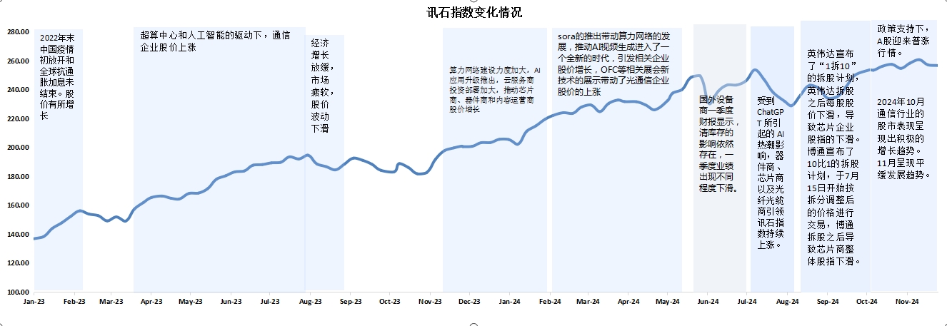 ICC訊 2024年11月通信行業(yè)的股市表現(xiàn)呈現(xiàn)平緩趨勢。截止到11月29日,訊石統(tǒng)計的指數(shù)值為256.73,比上月的257.49下滑0.76,11月市場整體呈現(xiàn)平緩趨勢,略微下滑。11月美國大選落定,美國主要股指創(chuàng)下新高,主要科技股都在大漲。運營商發(fā)力智算,云廠商加大算力投入,算力賽道蓬勃發(fā)展,整體通信信業(yè)平穩(wěn)運行。盡管整體股市表現(xiàn)平緩,但通信行業(yè)的細分領(lǐng)域卻呈現(xiàn)出不同發(fā)展趨勢。