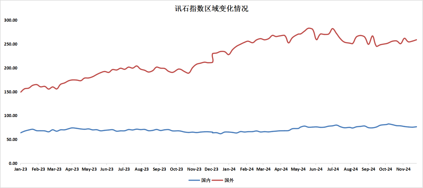 按地區(qū)劃分,截止到11月29日,ICC所統(tǒng)計的國內(nèi)通信指數(shù)為76.46,環(huán)比下滑2.99%。國外通信指數(shù)為258.89,較上月增長0.94%。在美國大選后,市場對經(jīng)濟政策的樂觀預期推動了國外通信股指的上漲。