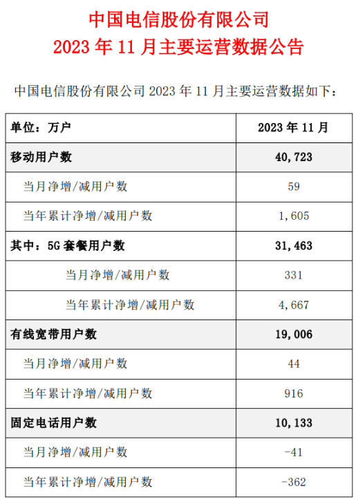 中國電信公布11月主要運營數(shù)據(jù)