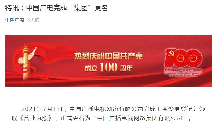ICC訊  近日,中國廣電表示,2021年7月1日,中國廣播電視網(wǎng)絡(luò)有限公司完成工商變更登記并領(lǐng)取《營業(yè)執(zhí)照》,正式更名為“中國廣播電視網(wǎng)絡(luò)集團有限公司”。