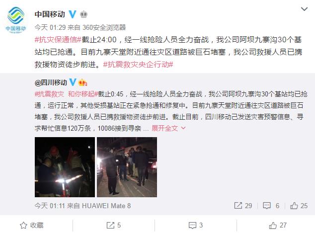 截止0:45,經(jīng)一線搶險人員全力奮戰(zhàn),我公司阿壩九寨溝30個基站均已搶通,運行正常,其他受損基站正在緊急搶通和修復(fù)中。目前九寨天堂附近通往災(zāi)區(qū)道路被巨石堵塞,我公司救援人員已攜救援物資徒步前進。截止01:29,四川移動己發(fā)送災(zāi)害預(yù)警信息、尋求幫忙信息120萬條,10086接到尋親電話100余個并在逐一核查當(dāng)中、處理災(zāi)區(qū)緊急開機需求4件,幫助5名震區(qū)用戶成功聯(lián)系到家人報平安,各項抗震保通工作正在有序進行。