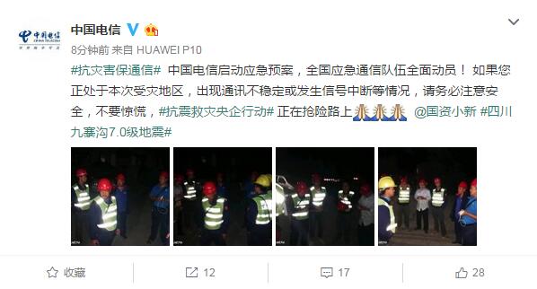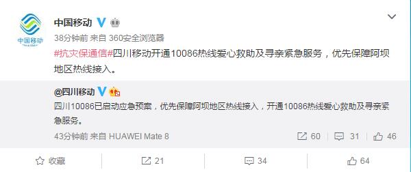 災(zāi)情發(fā)生后,三大運營商第一時間啟動應(yīng)急搶險保通信工作。中國移動發(fā)布微博稱,地震發(fā)生后,中國移動立即對受災(zāi)地區(qū)通信設(shè)施進行核查,了解災(zāi)情對移動通信網(wǎng)絡(luò)帶來的影響,對阿壩地區(qū)和附近地市開啟免停機服務(wù)。并開通10086熱線愛心救助及尋親緊急服務(wù),優(yōu)先保障阿壩地區(qū)熱線接入。