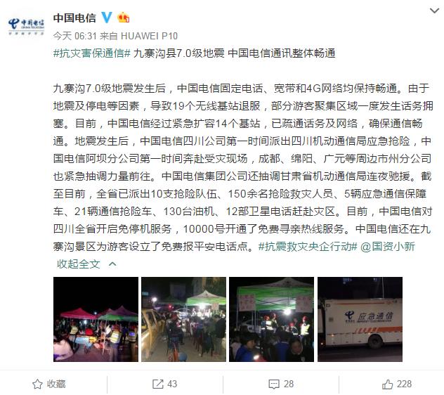九寨溝7.0級地震發(fā)生后,中國電信固定電話、寬帶和4G網(wǎng)絡(luò)均保持暢通。由于地震及停電等因素,導(dǎo)致19個無線基站退服,部分游客聚集區(qū)域一度發(fā)生話務(wù)擁塞。目前,中國電信經(jīng)過緊急擴容14個基站,已疏通話務(wù)及網(wǎng)絡(luò),確保通信暢通。地震發(fā)生后,中國電信四川公司第一時間派出四川機動通信局應(yīng)急搶險,中國電信阿壩分公司第一時間奔赴受災(zāi)現(xiàn)場,成都、綿陽、廣元等周邊市州分公司也緊急抽調(diào)力量前往。中國電信集團公司還抽調(diào)甘肅省機動通信局連夜馳援。截至目前,全省已派出10支搶險隊伍、150余名搶險救災(zāi)人員、5輛應(yīng)急通信保障車、21輛通信搶險車、130臺油機、12部衛(wèi)星電話趕赴災(zāi)區(qū)。目前,中國電信對四川全省開啟免停機服務(wù),10000號開通了免費尋親熱線服務(wù)。中國電信還在九寨溝景區(qū)為游客設(shè)立了免費報平安電話點。