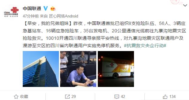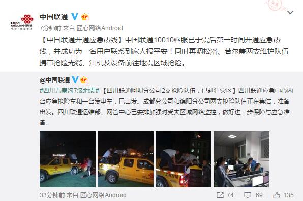 中國聯(lián)通首批已組織8支搶險隊伍、56人、3輛應(yīng)急基站車、16輛應(yīng)急搶險車,35臺發(fā)電機、20公里通信光纜前往九寨溝地震災(zāi)區(qū)搶險救災(zāi)。10010開通四川聯(lián)通尋親報平安熱線,對九寨溝地震災(zāi)區(qū)聯(lián)通用戶及漫游至災(zāi)區(qū)的四川省內(nèi)聯(lián)通用戶實施免停機服務(wù)。