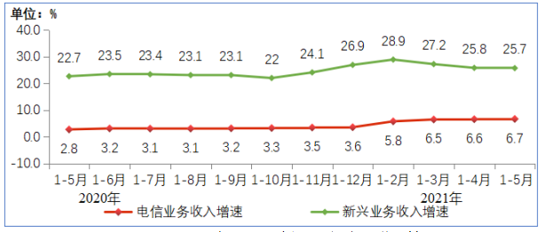圖2 2020-2021年1-5月新興業(yè)務(wù)收入增長情況