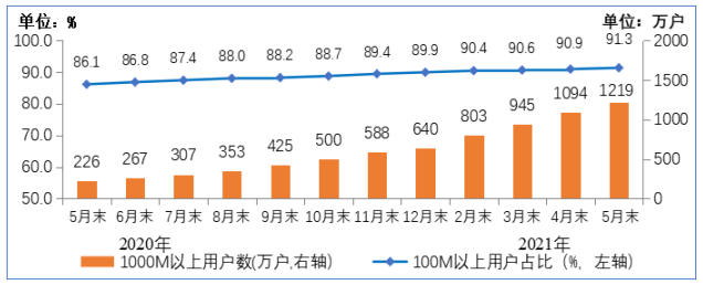 圖3 2020年-2021年5月末100M速率以上、1000M速率以上的固定互聯(lián)網(wǎng)寬帶接入用戶情況