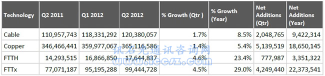 2012年光纖繼續(xù)表現(xiàn)出強(qiáng)勁的增長(zhǎng)態(tài)勢(shì),但增長(zhǎng)速度,尤其是混合技術(shù),正在下滑。如下表: