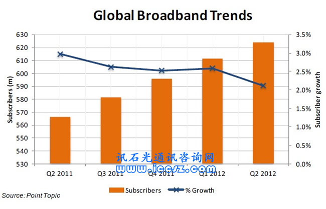 【訊石光通訊咨詢網(wǎng)】截止到2012年6月底,全球寬帶用戶總數(shù)達(dá)到6.241億,環(huán)比增長(zhǎng)了2.1%——但相比上一季度,增長(zhǎng)速度有明顯的下降。