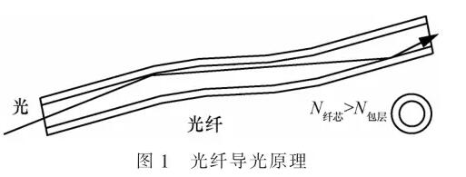 光纖導(dǎo)光原理如圖1所示。光纖是由二層不同折射率的石英玻璃構(gòu)成的,芯的折射率大于包層的折射率,構(gòu)成全反射,使光信號(hào)可彎曲傳輸。光纖芯必須是“9個(gè)9”、即0.999 999 999的超純石英,以保證光纖的傳輸損失極小?! ?/p>