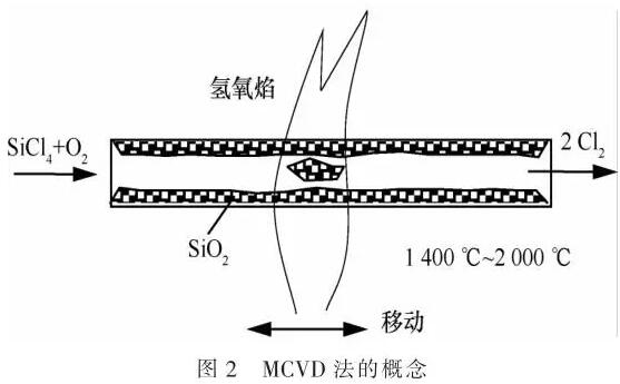 MCVD法即先將購(gòu)買來(lái)的普通石英管,通入氣體原料,在管外用氫氧焰加溫至1 400℃,使之產(chǎn)生化學(xué)反應(yīng),產(chǎn)生石英粉末,附在石英管壁上。來(lái)回移動(dòng)氫氧焰,附在石英管壁上的石英粉末加厚,直至達(dá)到需要的厚度。最后,氫氧焰加溫至2 000℃,使管內(nèi)的石英粉熔成透明的石英,同時(shí),包層石英管也因變軟而收縮,自動(dòng)填滿中心孔而形成光纖“預(yù)制棒”。