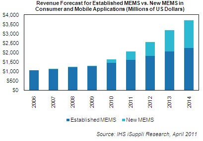 IHS公司分析師表示,2011年預計MEMS器件的銷售額將達到4.573億美元,比2010年的1.776億美元增長了約2.5倍。新的MEMS領域還包括3軸陀螺儀和微型投影設備等產品,這在2006年是不存在的。到2014年,全新的MEMS市場規(guī)模將達到14億美元。
