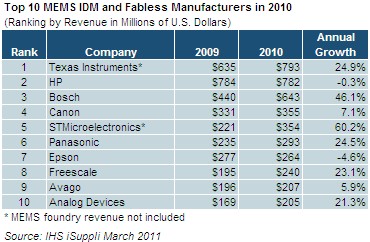 “新的MEMS技術是今天最令人興奮的技術,它將引領許多新電子產品出現(xiàn)在世人面前,應用領域從視頻游戲的遙感器到平板導航系統(tǒng)、智能手機的嵌入式微型攝影器。”IHS公司的MEMS和傳感器首席分析師Jérémie Bouchaud說。“這將為新的MEMS整體市場提供快速增長的動力。”